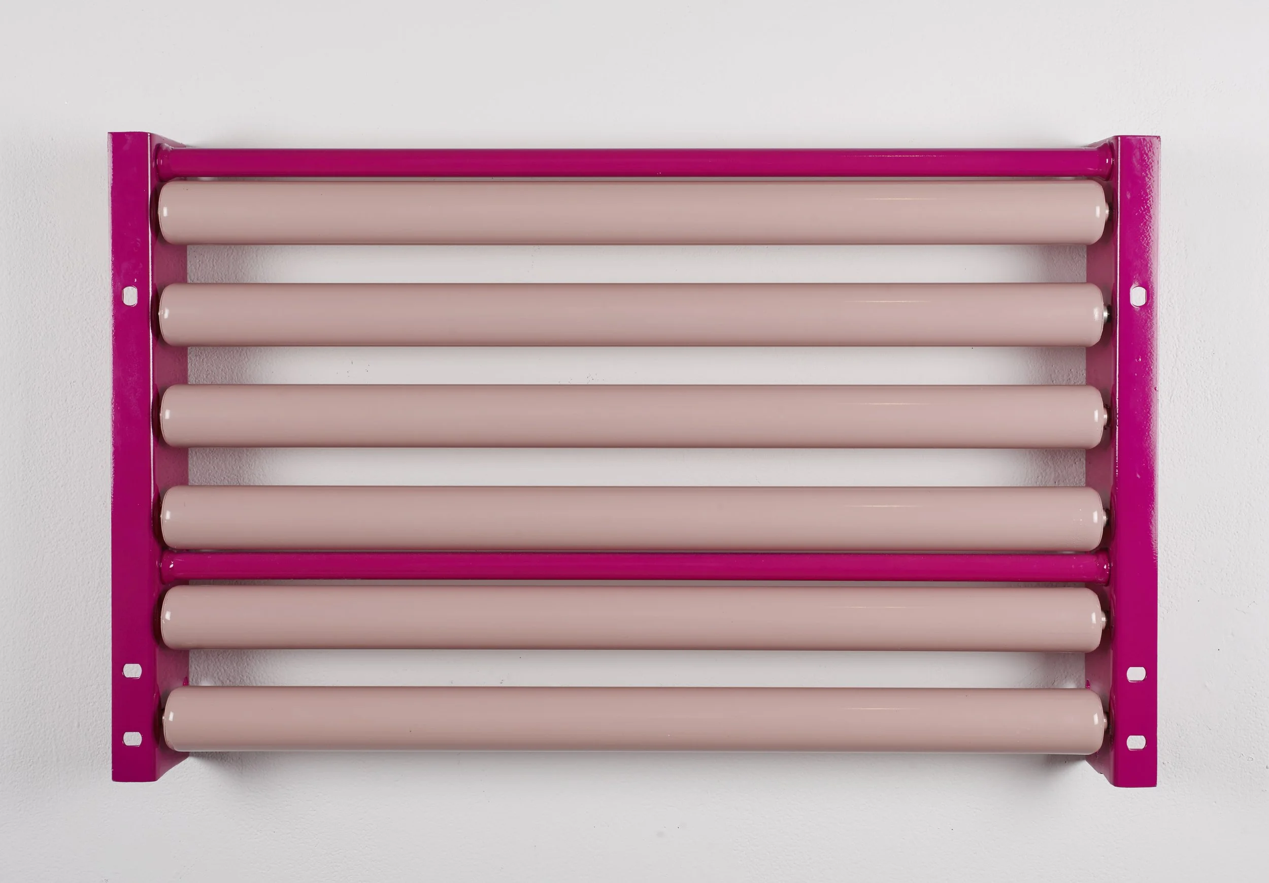 These sculptures speak to my personal and familial histories and celebrate survival. The Let Go Byes Be Go Byes series is built from factory conveyor belts and painted in brilliant color. Rooted in the Council, Seymore, Seymour, Eleazer, Foster, Ward history of working in the potato graders of the Hamptons, and a tradition of colorful storytelling, the conveyors point to hard labor while their arching forms recall minimalist sculpture.